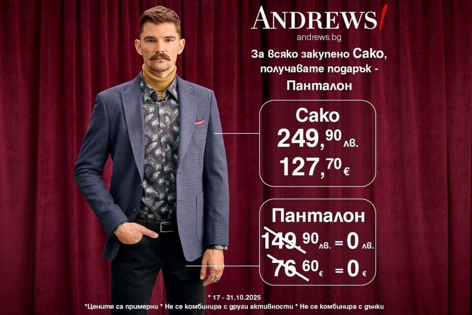Безупречното поведение заслужава безупречно облекло. За всеки джентълмен Andrews има специално предложение! Купувайки сако, получавате подарък - панталон! Само от 17 до 31 октомври! Andrews! Be a gentleman!