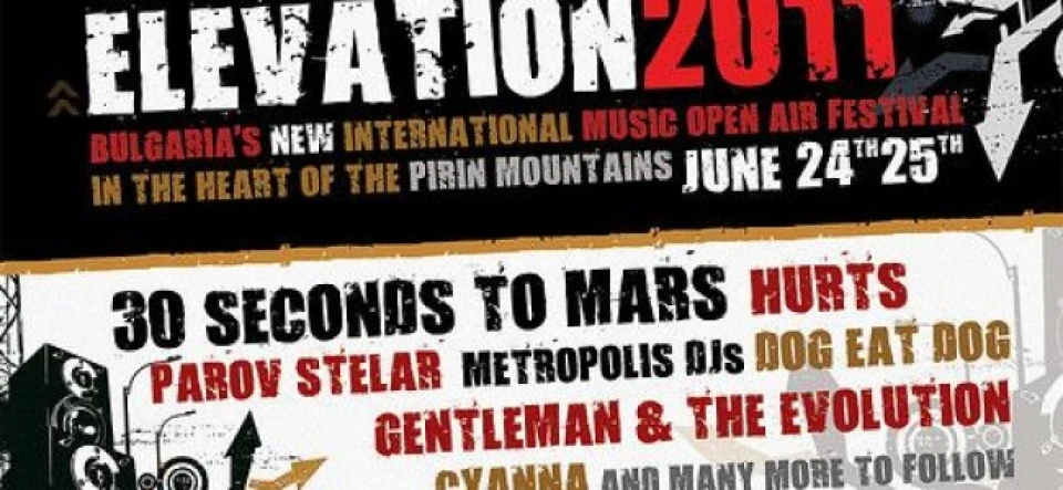 Задава се едно голямо музикално събитие! Първото издание на музикалния фестивал "Elevation 2011" ще се проведе на 24 и 25 юни край Разлог и ще събере на една сцена 30 SECONDS TO MARS, HURTS, Parov Stelar, Metropolis DJs, Dog Eat Dog, Gentleman & The Evolution и Cyanna! (на снимката е плаката на събитието)