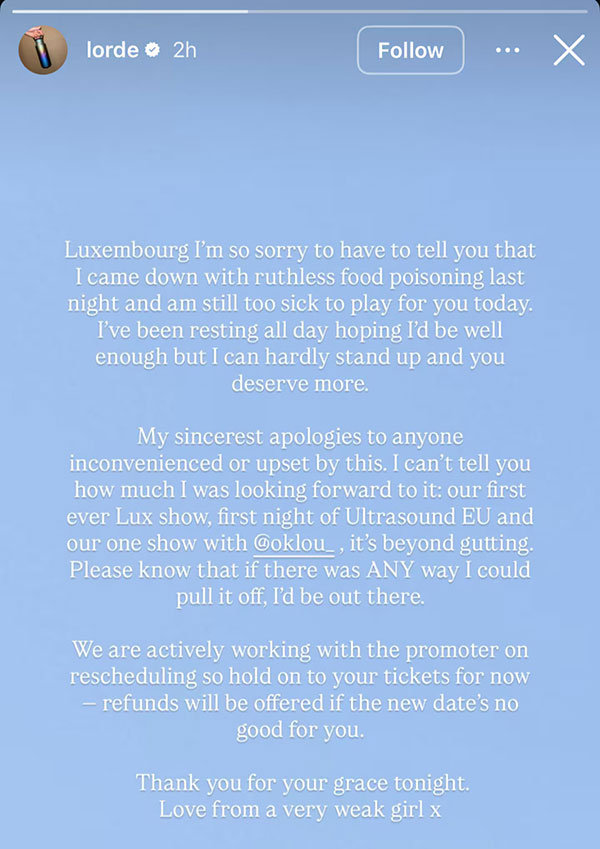 Lorde се извини на феновете закупили билети за причиненото неудобство: "Не мога да ви опиша колко много очаквах този концерт — първото ни шоу в Люксембург, първата вечер от Ultrasound EU и единственото ни участие с френската музикантка Oklou. Наистина е съкрушително", продължи 29-годишната певица. "Моля, знайте, че ако имаше как да го направя, щях да бъда там. Изпращам ви любов от едно много слабо момиче."