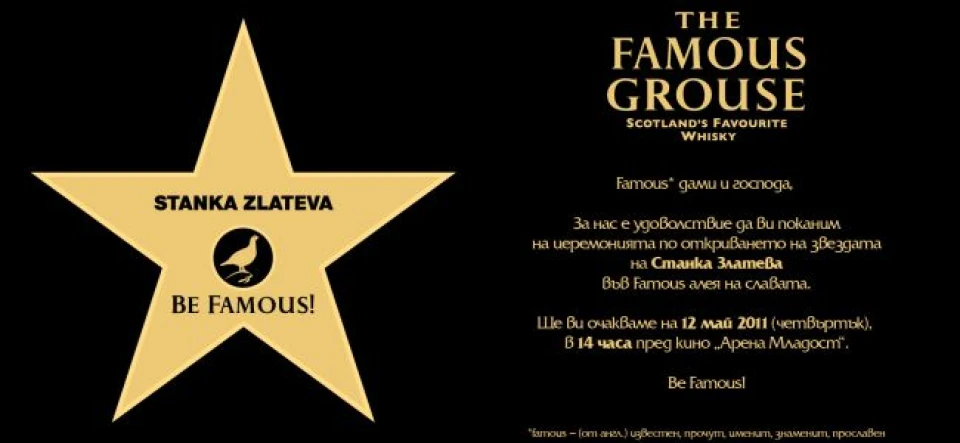 Famous Алея на славата е създадена през октомври 2005 година пред кино „Арена Младост” с идеята да събере на едно място имената на българите, допринесли за прославянето на страната ни по света и за положителния й международен имидж. До момента това са 20 сънародници, сред които Христо Стоичков, Васко Василев, Димитър Бербатов, Лили Иванова, Валя Балканска, сестри Малеевии, Теодосий Спасов, Васил Найденов, Веселин Топалов, Стефка Костадинова, Елица и Стунджи, Астор и други. Зад инициативата стои любимото уиски на Шотландия - The Famous Grouse Scotch Whisky, а номинациите се издигат от деветчленно жури, съставено от почитани общественици. Организаторите предвиждат скоро гласуването за Famous звездите да стане публично и в него да участват всички българи.