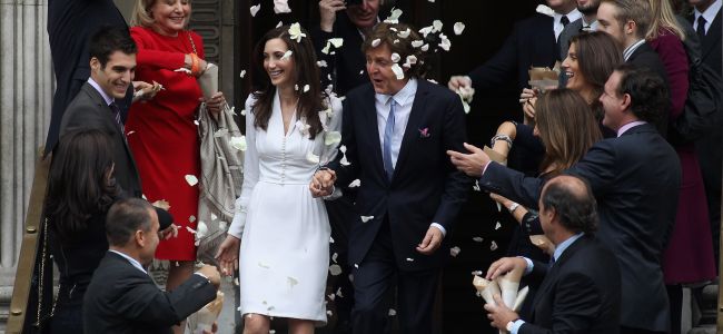 Сър Пол бе в тъмен костюм, а Нанси Шевъл, наследница на богат американски предприемач, с бяла вталена рокля до коленете и с цвете в косата. Хванали се под ръка младоженците позираха за кратко пред камерите и поздравиха публиката. След това двойката се отправи към дома на Пол Макартни в северозападен Лондон, за да даде прием за близките и приятелите си.